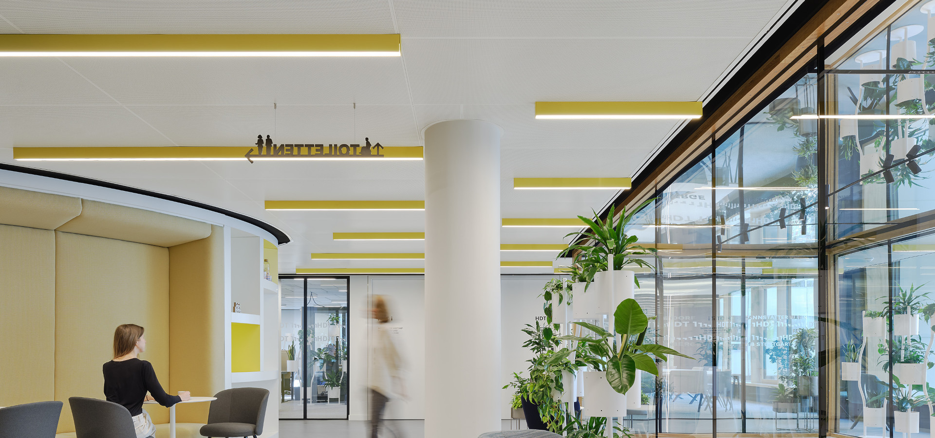 Durch Regulierung der Nachhallzeit und Dämpfung des Geräuschpegels entstehen Räume zum konzentrierten Arbeiten und zum Wohlfühlen.
